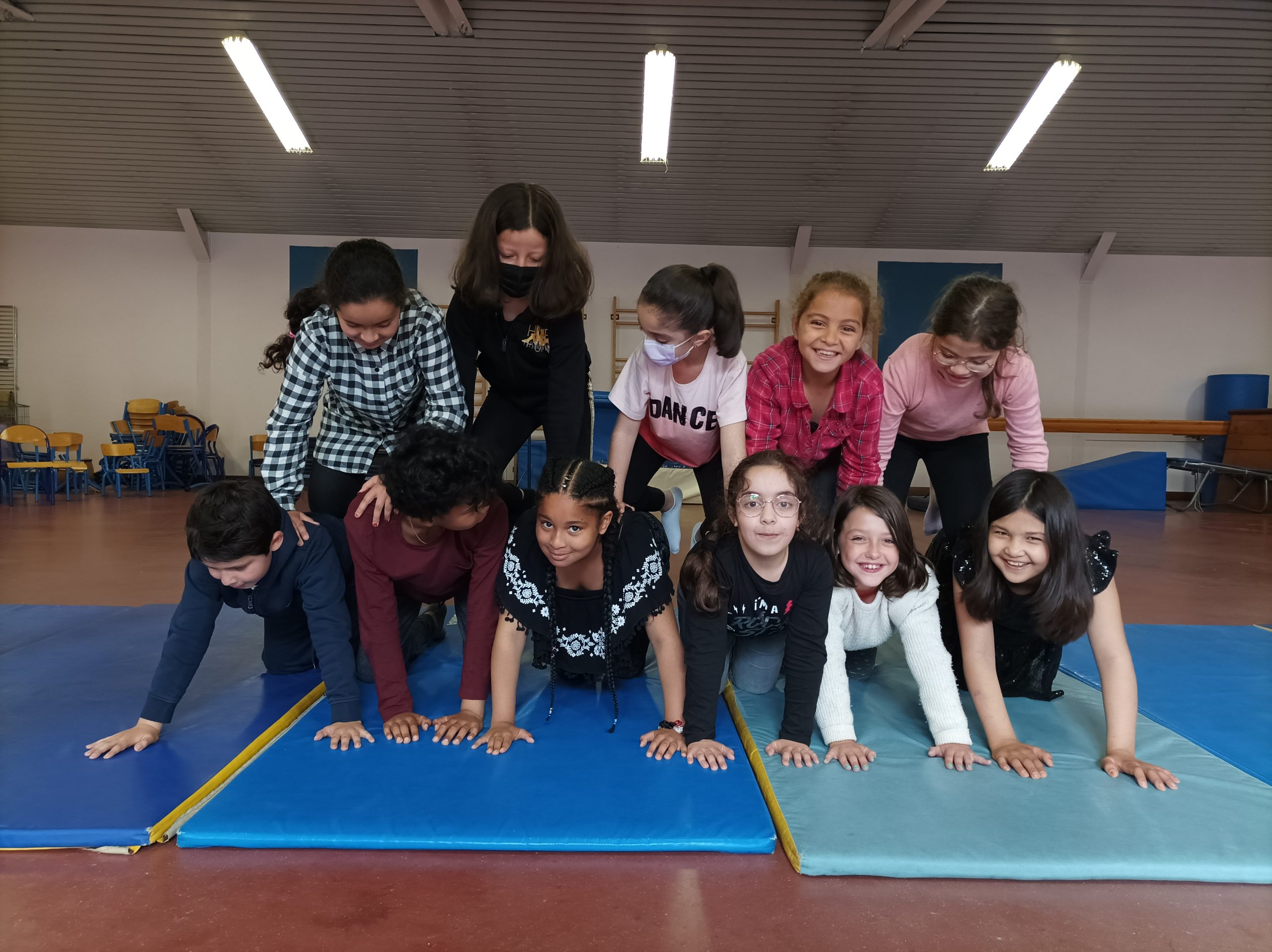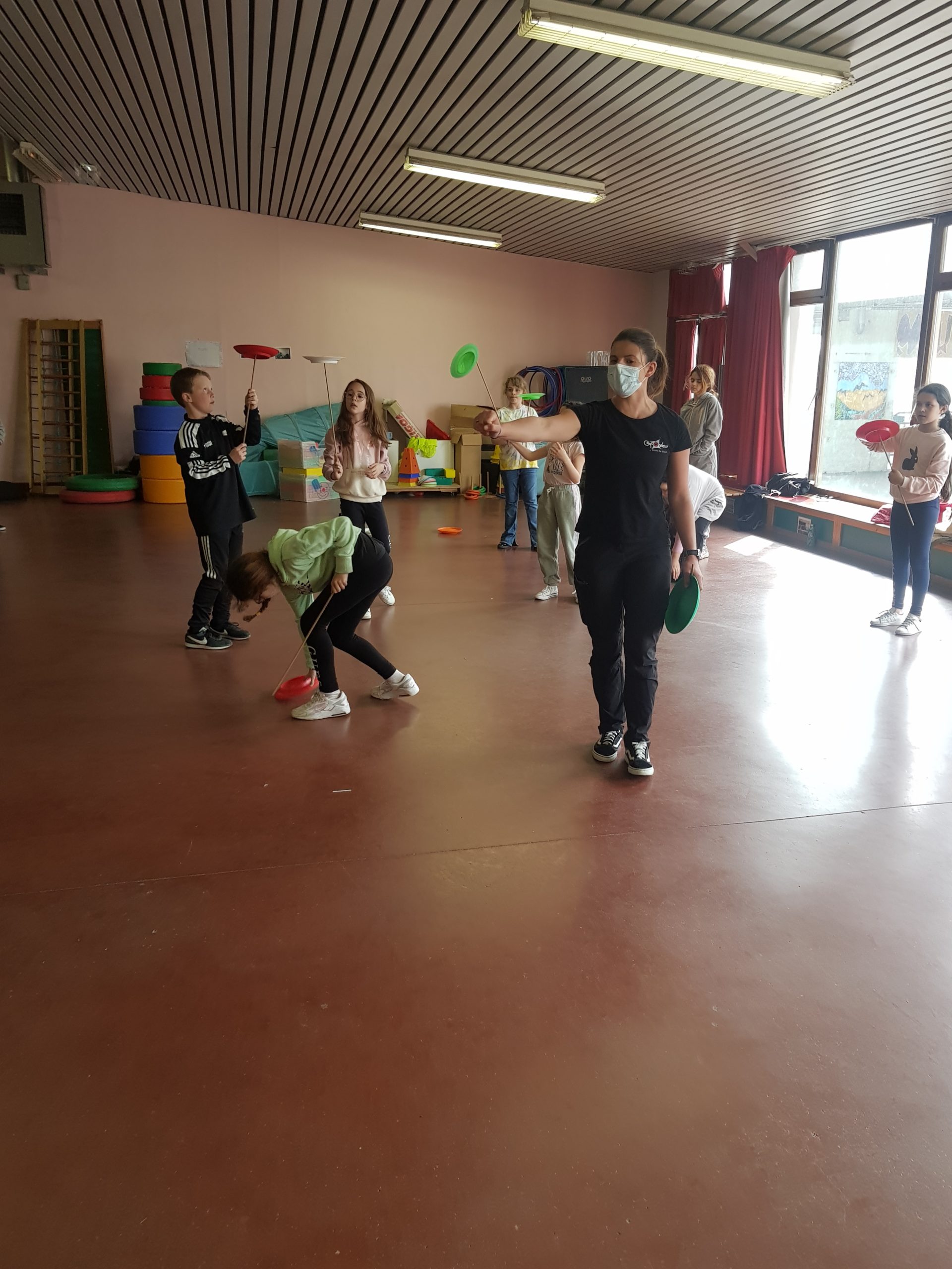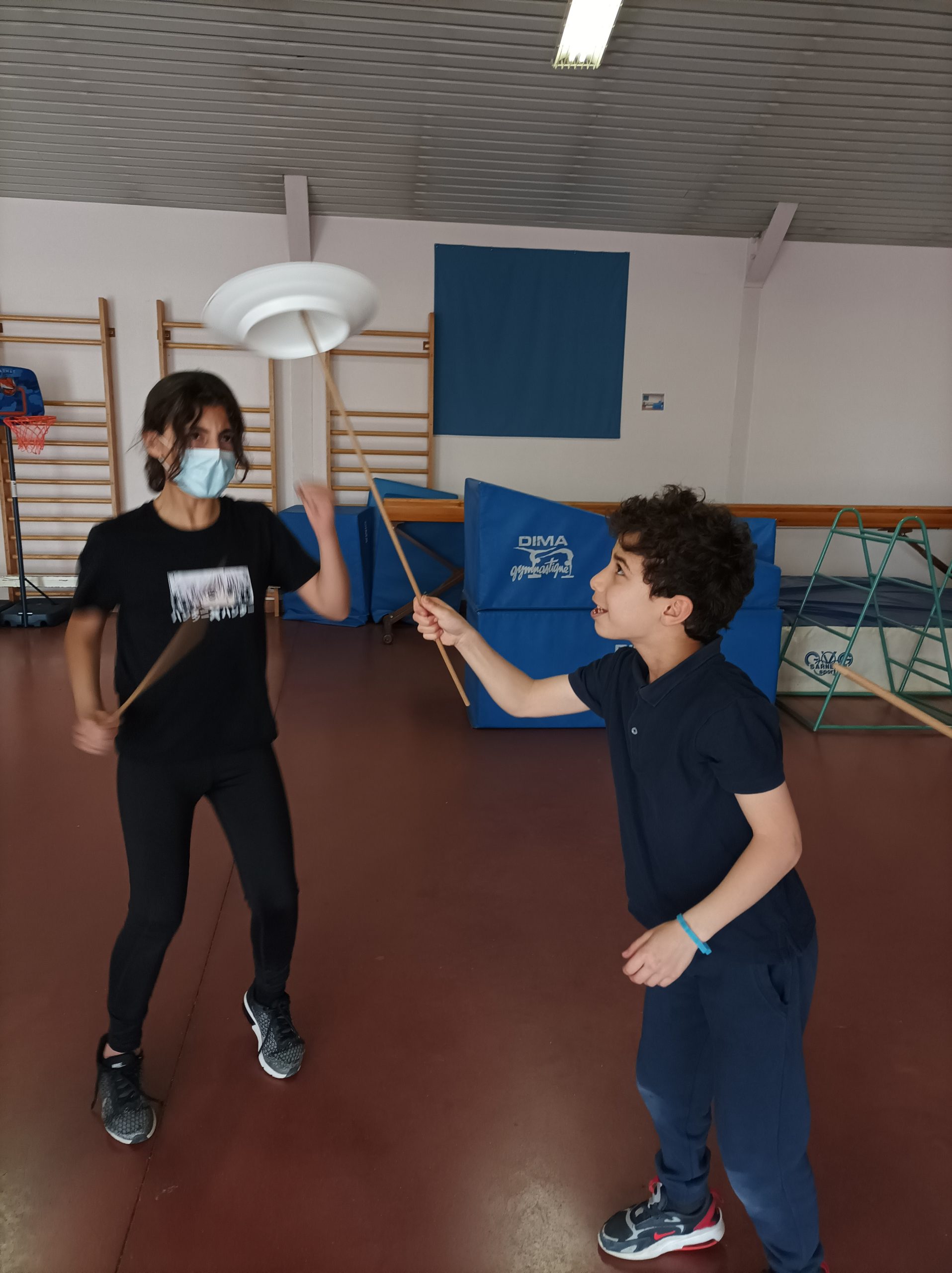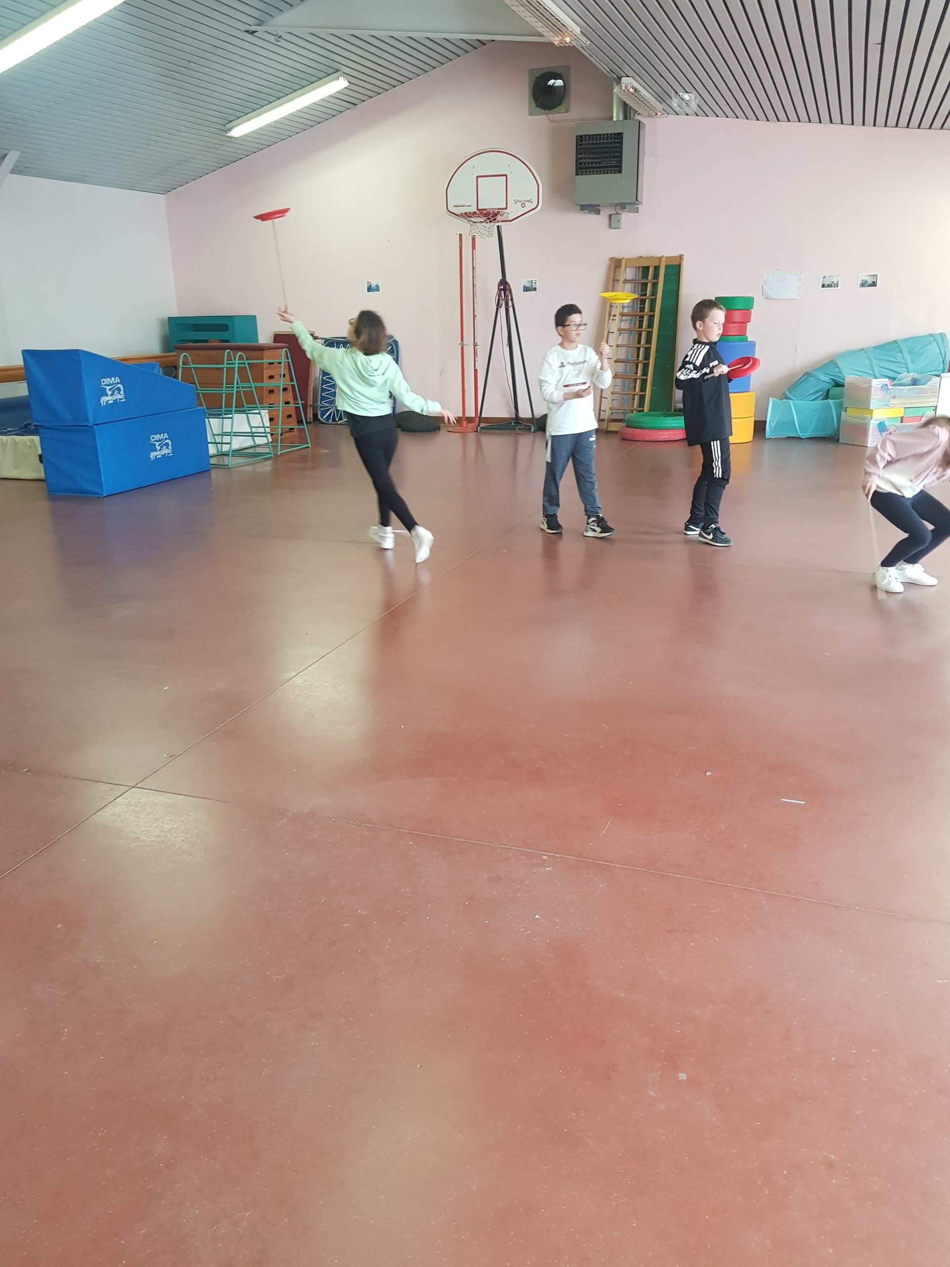 Depuis quelques semaines, nous faisons du Cirque avec Cirqu’onflexe. On travaille en groupe pour préparer un spectacle. Nous faisons des activités pour apprendre à faire plein de choses, ou au moins essayer : le bâton à fleurs, le diabolo, les balles (jonglage), le trapèze, la pyramide humaine, les assiettes chinoises, le mât chinois, le trampoline, marcher sur une boule, sur un fil, sur une planche en équilibre, le monocycle, des roulades…
